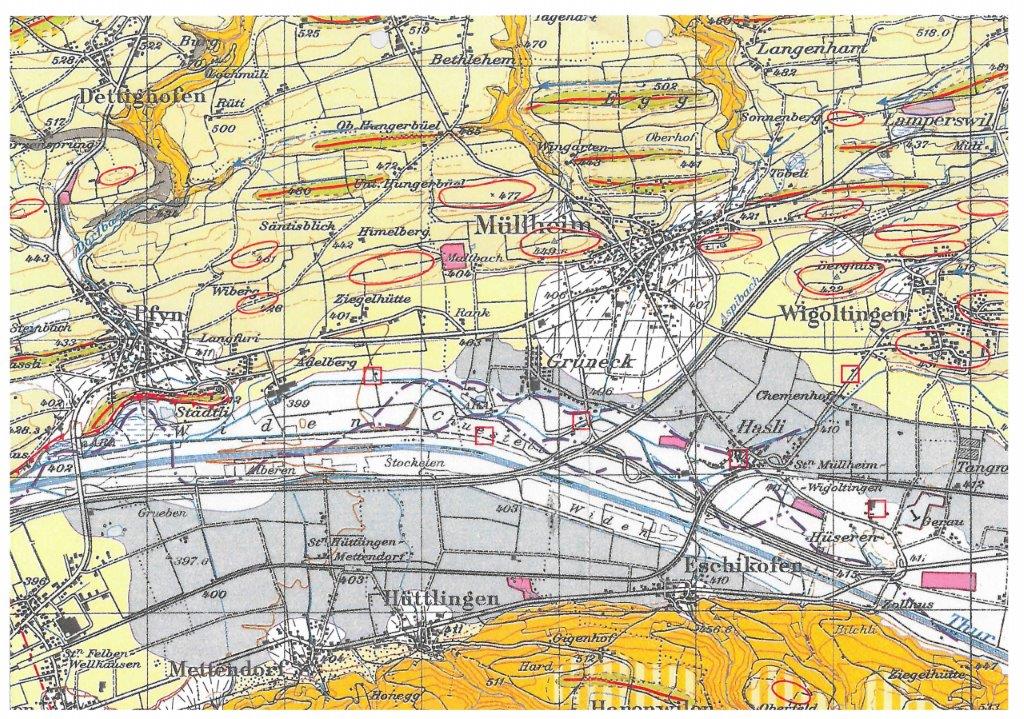 Strich – Punkt: bei der ARA Pfyn / beim Städtli Pfyn / im Gebiet „Widen“ / bei der ARA Müllheim / bei „Hüseren“