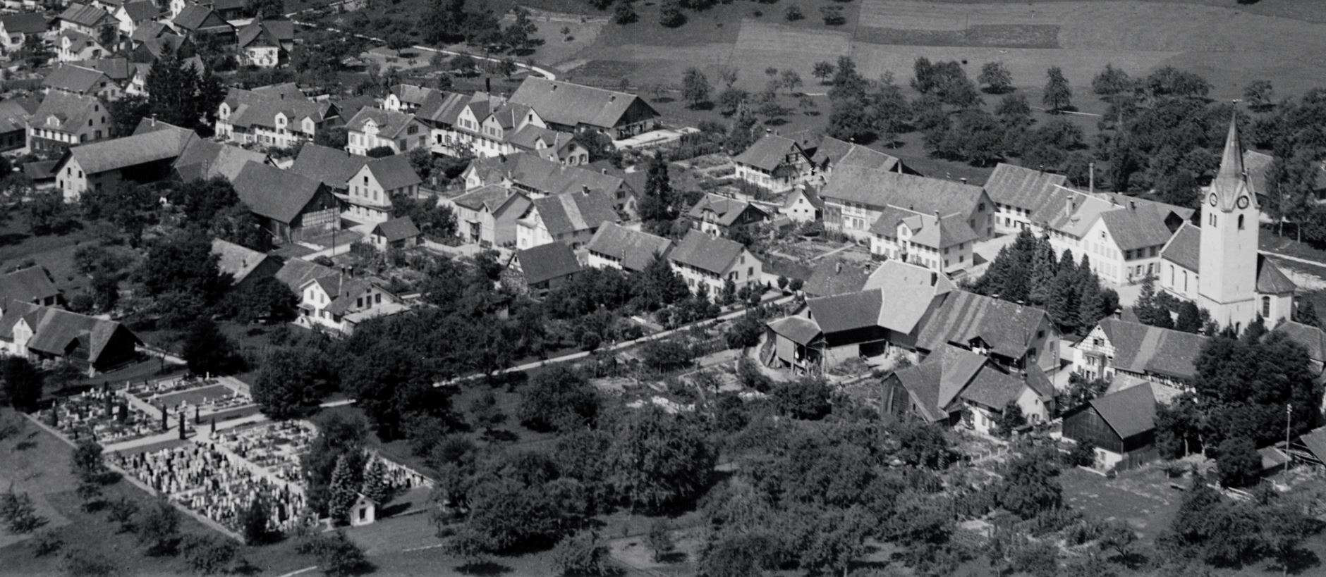 Unser Friedhof war früher neben der Kirche, auf der Seite der Strasse. Auf dem Bild von R. Labhart sind dort einheitliche, schlichte Grabkreuze zu sehen.