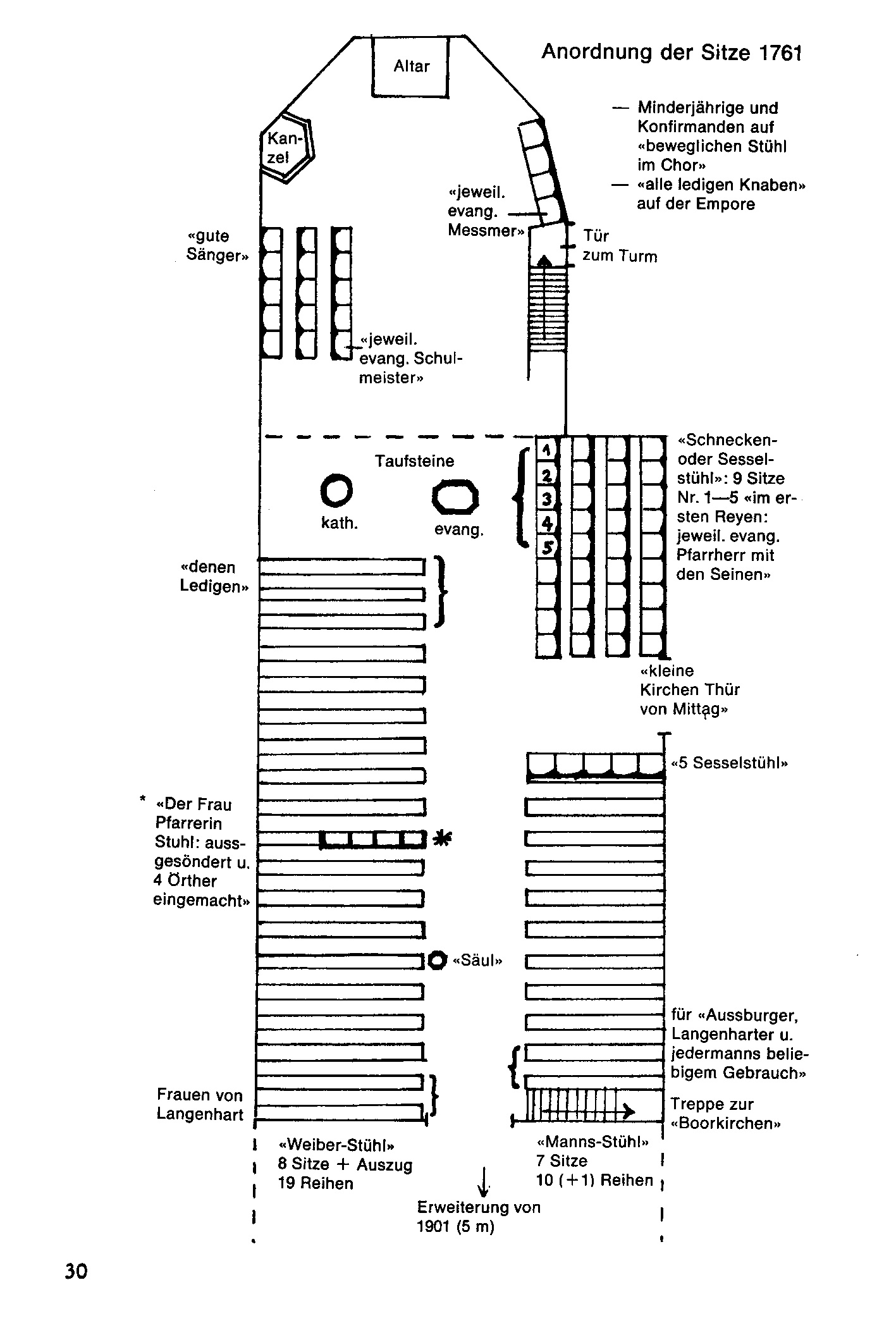 Im vergangenen Jahrhundert hat sich das Innere der müllheimer Kirche mehrmals wesentlich verändert. In der Festschrift „700 Jahre Kirche St. Verena“ gibt es eine Darstellung der Kirche um 1761. Wir wissen aber nicht aufgrund welcher Quellen die Skizze erstellt wurde. Man sieht darin die Treppe zum erhöhten Turmeingang (die Türe im Chor wurde erst 1902 ausgebrochen). Die Kanzel befindet sich im Chor.