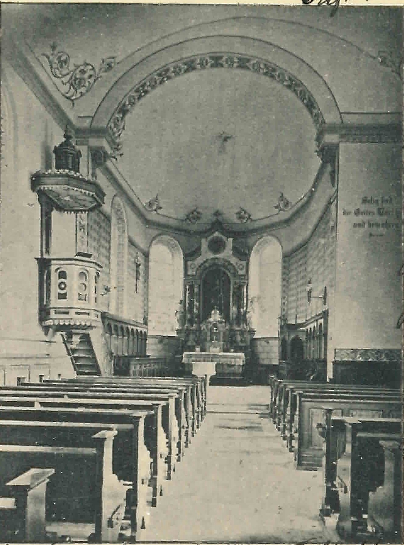 Es war eine helle Kirche mit dem katholischen Altar vorne in der Mitte und der Kanzel an der Nordwand. Das Chorgestühl ist vorhanden, welches wie die Bänke der Kirche aus dunklem Holz gefertigt ist. Vorne Rechts an der Wand neben dem Chor ist an die Wand gemalt der Vers: „Selig sind, die Gottes Wort hören und bewahren“.