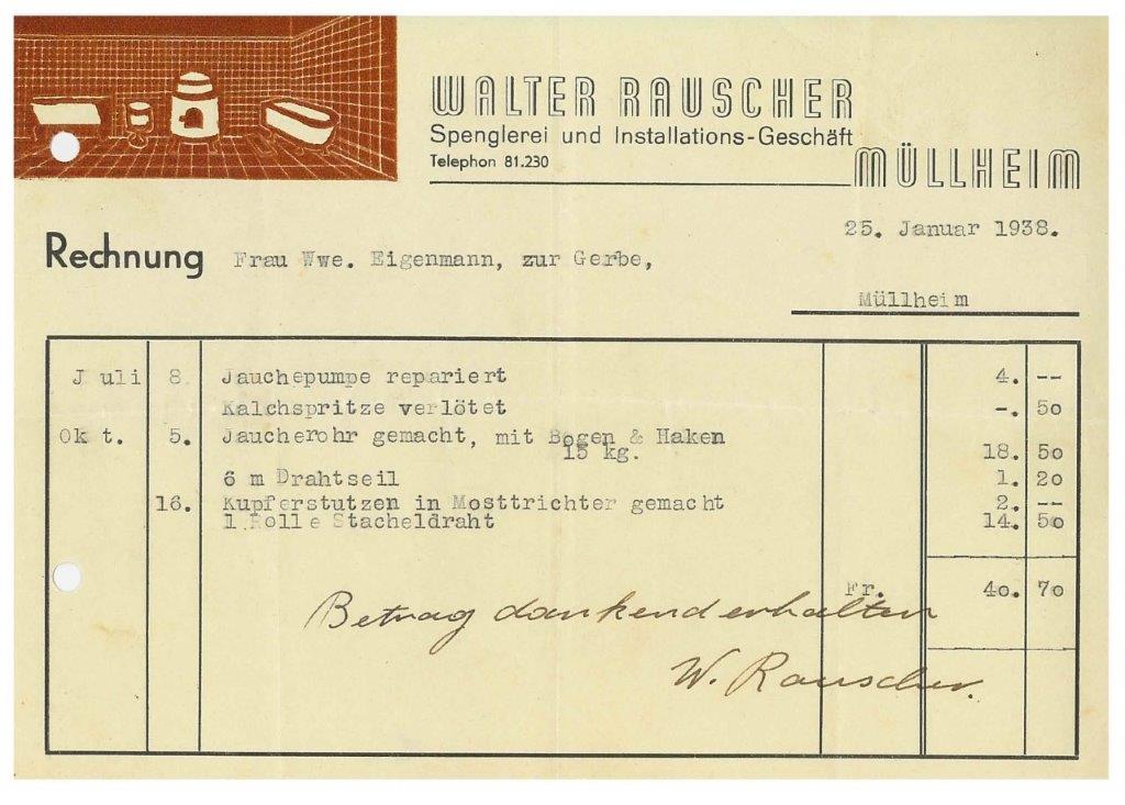 Rechnung, Rauscher, Spengler, 1938