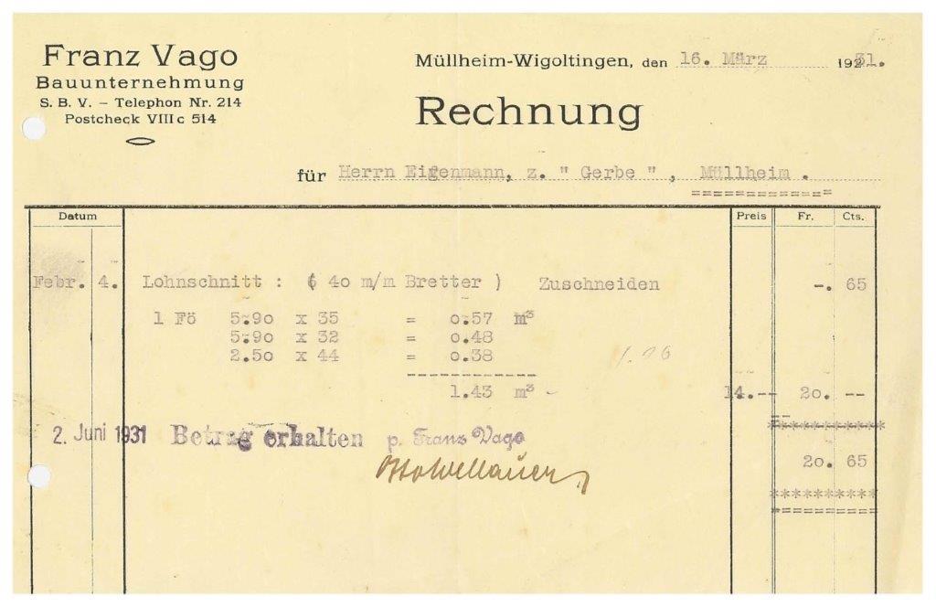 Rechnung, Vago, Bauunternehmung, 1931